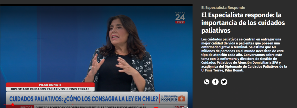 Acompañamiento, con una mirada bio psicosocial y espiritual, tanto del paciente como de su familia, es lo que corresponde a los cuidados paliativos tras el diagnóstico de una enfermedad terminal, es decir, que no tiene cura. La académica del diplomado de Cuidados Paliativos de la Universidad Finis Terrae, enfermera Pilar Bonati, fue entrevistada sobre este ámbito de la Medicina en el programa El Especialista Responde, del canal 24 horas.
