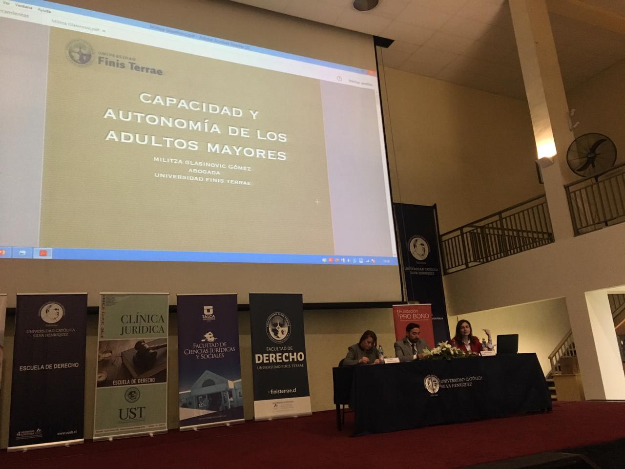 En el encuentro, participaron instituciones y facultades de Derecho colaboradoras de Servicio Nacional del Adulto Mayor (SENAMA), como la Fundación Pro-Bono, Universidad Católica Silva Henríquez; Fundación Integral de la Familia (FIDEF) y Universidad Finis Terrae con el tema “Aspectos Generales de la Capacidad y Autonomía de los Adultos Mayores y Análisis de la Ley 18.600” a cargo de Militza Glasinovic.