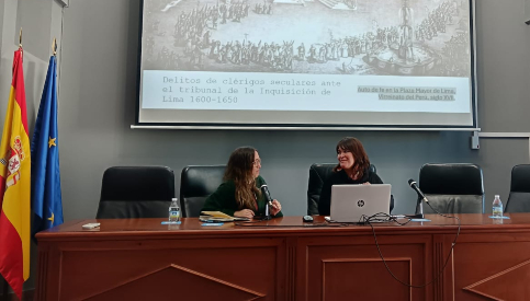En esta instancia, la Dra. Macarena Sánchez (en la foto de la presentación, a la derecha) expuso su ponencia “Delitos de clérigos seculares en el Tribunal de la Inquisición de Lima”, mientras que el Dr. Ignacio Chuecas, director de nuestro Doctorado Interdisciplinario en Humanidades, presentó su investigación “Comercio, malsines y agenda inquisitorial: ciclos de persecución contra judaizantes en el Tribunal del Santo Oficio de Lima (1600-1650)”. Ambas presentaciones forman parte del Proyecto Fondecyt Regular N° 1241967, que busca profundizar en las agencias de familias conversas dentro del contexto imperial de los siglos XVI y XVII.