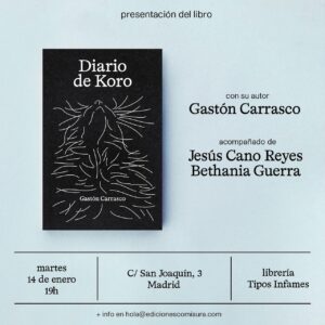 Además, en Madrid y Málaga el académico presentó la versión española de su libro “Diario de Koro” (2021), que tiene como personajes centrales un poeta y un gato, quienes reflexionan sobre animalidad y escritura. El texto fue presentado en Madrid en la librería Tipos Infames por Jesús Cano y Bethania Guerra y en Málaga, en la librería Cortázar, de esa ciudad, por parte del escritor ítalo español, Angelo Néstore.