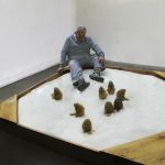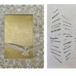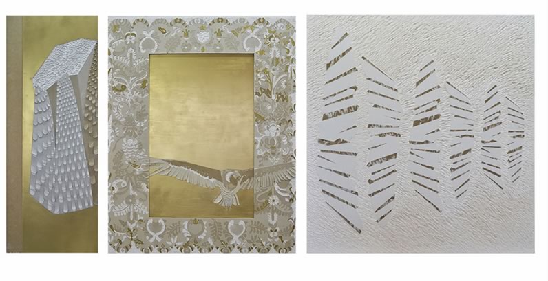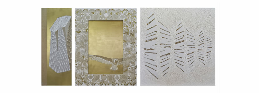 Finalmente, Macarena Alvarado obtuvo una Mención Honrosa por su trabajo “Ascensión en plumas, piedras y rococó”, hecho de planchas de yeso, cartón, pintura spray, acrílico, impermeabilizante, gubias y bisturí. “Las Vulcanitas son planchas compuestas por un núcleo de yeso y revestidas en ambas caras por cartón. Empleadas usualmente en la construcción contemporánea de tabiques y revestimientos, son sacadas de su contexto originario para crear una instalación compuesta de 3 cuadros y un volumen. La trilogía de cuadros retrata en el centro a un cóndor andino en vuelo sobre un fondo dorado, contenido por un marco de vulcanita tallada estilo rococó. A ambos costados, se despliegan otros 2 cuadros de aspecto pétreo, cuyas formas se basan en la reinterpretación y abstracción geométrica de las alas abiertas del cóndor, trabajadas a distintas escalas. Plumas livianas se vuelven pesadas y macizas haciendo referencia a objetos rituales para acompañar al cóndor en el despegue de la tierra y su transitar por el cielo. Sobre la proyección de estas ideas se sujeta la ornamentación rococó, tan utilizada en altares, así como otros símbolos ligados a líneas místicas y tribales como tótems y apachetas (montículos de piedras construidos por los viajeros como ofrendas para apartar desgracias y pedir salud y tranquilidad en el camino de su ruta). Desde el suelo y hasta el costado inferior de la trilogía de cuadros, se construye un volumen escalonado compuesto de listones de vulcanita que bajo su composición vertical no hacen sino otra cosa que reiterar el afán de ascender y conectar con otros mundos. ASCENSIÓN EN PLUMAS, PIEDRAS Y ROCOCÓ busca potenciar y descubrir las cualidades y posibilidades materiales dadas por la vulcanita, bajo una laboriosa manufactura que revela texturas, sombras, bajos relieves, volúmenes y tonos distintos, amparados en el interés de aprehender otros tiempos, dimensiones y misterios sin cuerpo ni forma”, señala la descripción de esta obra.
