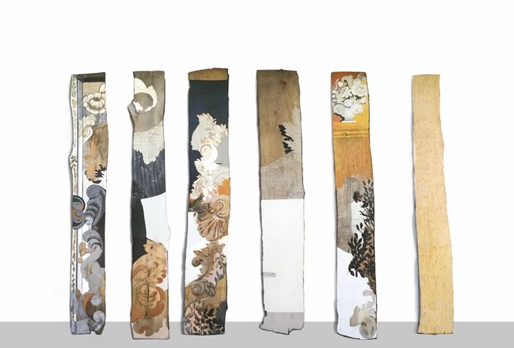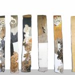 Pascuala Lira fue galardonada con el tercer lugar del concurso, donde a través de su obra “Susurros Chinos”, realizada en acrílico sobre madera, describe su trabajo como “Susurros chinos o más conocido como El teléfono o El teléfono roto, es un juego infantil que busca dejar en evidencia la deformación de un mensaje al traspasarse de una persona a otra. De igual manera, esta obra propone un sentido de distorsión entre el motivo ornamental del primer módulo, al del segundo y sucesivamente hasta el último. La obra se conforma por seis tablones de madera de Coihue pintadas con acrílico. Esta no se encuentra tratada, sino que se presenta de manera rustica, tal cual queda al cortar el troco. Cada pieza es de 50 cm de ancho por 3mts. de alto aprox. Estas se disponen una junto a la otra intercalándose por un espacio libre en la pared. Y se apoyan de forma vertical en el suelo, contando con un total de 3 x 3 metros aprox. Para este trabajo se toma como referencia los motivos ornamentales fitomórficos de los murales andinos del barroco novohispano. En estos murales vemos una apropiación indígena de los lenguajes pictóricos occidentales traídos por los españoles con el propósito de evangelizar. El motivo de las pinturas se mezcla con la estética y simbología ingenua, recargada y sus ganas de hacer vistosa y elegante las iglesias y construcciones de barro y paja. Árboles, flores y frutos, ornamentan marcos, paisajes e intersticios de las pinturas murales andinas. Junto con rústicos trampantojos de retablos, cortinajes y techos artesonados, la representación vegetal contribuye a construir un espacio ilusorio. De esta manera lo que se busca en esta obra es apropiarse de este referente, como en un inicio lo hicieron los pintores indígenas en la colonia y dejar que el ornamento tome un camino propio con otras influencias, con el modo como se adapta al formato y se modifica a través de la repetición. Más que un elemento distractor o de mero embellecimiento, el ornamento se ha escapado de su margen e irrumpe constantemente: Plantas, flores, hojas; un patrón cuadriculado; relieves fitomórficos; pinturas que remedan marcos o encuadres; ornamentos vegetales; patrones de espigas… formas orgánicas que se siguen, se mezclan, se conducen como en un diálogo de sordos… o como en el juego de los Susurros Chinos.”
