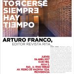 El arquitecto, crítico y editor español Arturo Franco, expondrá sobre su obra invitado por la Escuela de Arquitectura de la U.Finis Terrae. Franco es director y editor de la revista Rita_, revista asociada a las escuelas de Arquitectura de España e Iberoamérica, y de la plataforma digital Redfundamentos. Ha sido reconocido como uno de los jóvenes arquitectos españoles con mayor proyección por el diario El País, la Fundación Caja de Arquitectos, el Ministerio de Fomento (JAE), A+U, ArchitecturalDigest, y 2G, por sus obras, entre las que se incluyen las distintas intervenciones en el antiguo Matadero de Madrid. Su obra ha sido reconocida en los Swiss Architecture Awards (2010),con el gran premio FAD de España y en Portugal (2012), con el primer premio del Ayuntamiento de Madrid (2007).