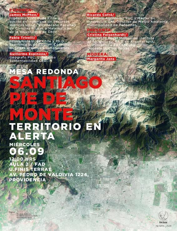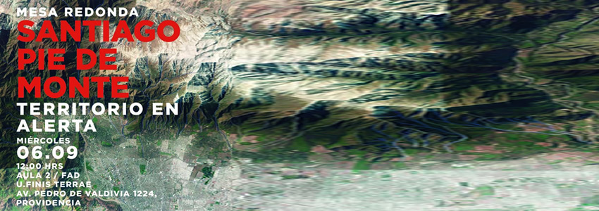 En el marco de la investigación “Franja ecotonal de transición, Santiago Pie de Monte”, que se encuentran desarrollando las docentes de Arquitectura Cristina Felsenhardt, Margarita Jans y Pamela Zúñiga, se realizará en la FAD la Mesa Redonda “Santiago Pie de Monte: Territorio en alerta”.