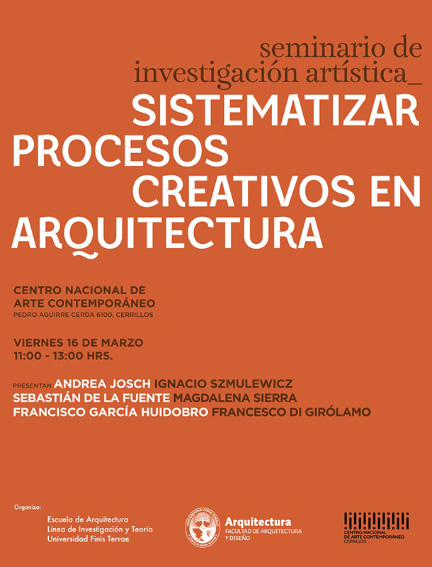 El viernes 16 de marzo a las 11.00 horas, la Escuela de Arquitectura realizará el “Seminario de investigación artística: sistematizar procesos creativos en Arquitectura”.
