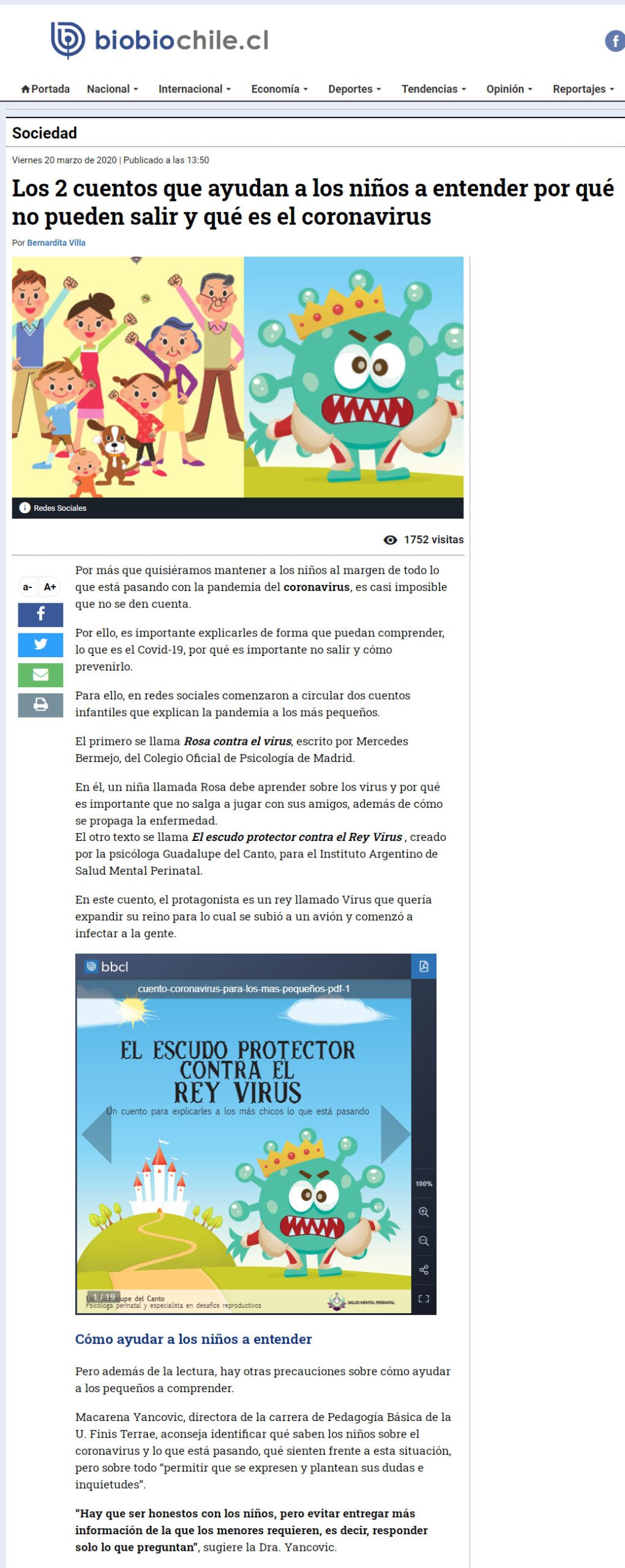 En una nota publicada por el portal BioBioChile, Macarena Yancovic, directora de la carrera de Pedagogía Básica de la U. Finis Terrae, aconsejó identificar qué saben los niños sobre el coronavirus y lo que está pasando, qué sienten frente a esta situación, pero sobre todo “permitir que se expresen y plantean sus dudas e inquietudes”.