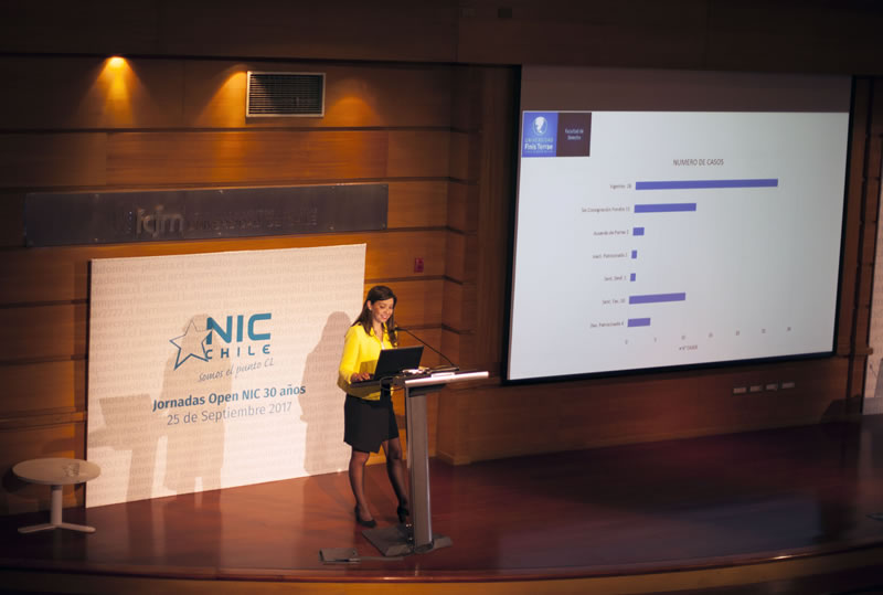 La directora legal y comercial de NIC Chile, Margarita Valdés, explicó en su ponencia que el convenio con universidades como la Finis Terrae nació de la idea de “reducir la sensación de indefensión de los titulares de los punto CL, que fueran personas naturales y no empresas. Para darles asesoría jurídica gratuita se nos ocurrió contactar a las clínicas jurídicas de varias universidades y proponerles hacerse cargo de un sistema novedoso en la comunidad jurídica que tiene que ver con un arbitraje en línea y, por otro lado, podían cumplir además el beneficio social de atender a personas que necesitan ayuda, pero que no tienen recursos”.