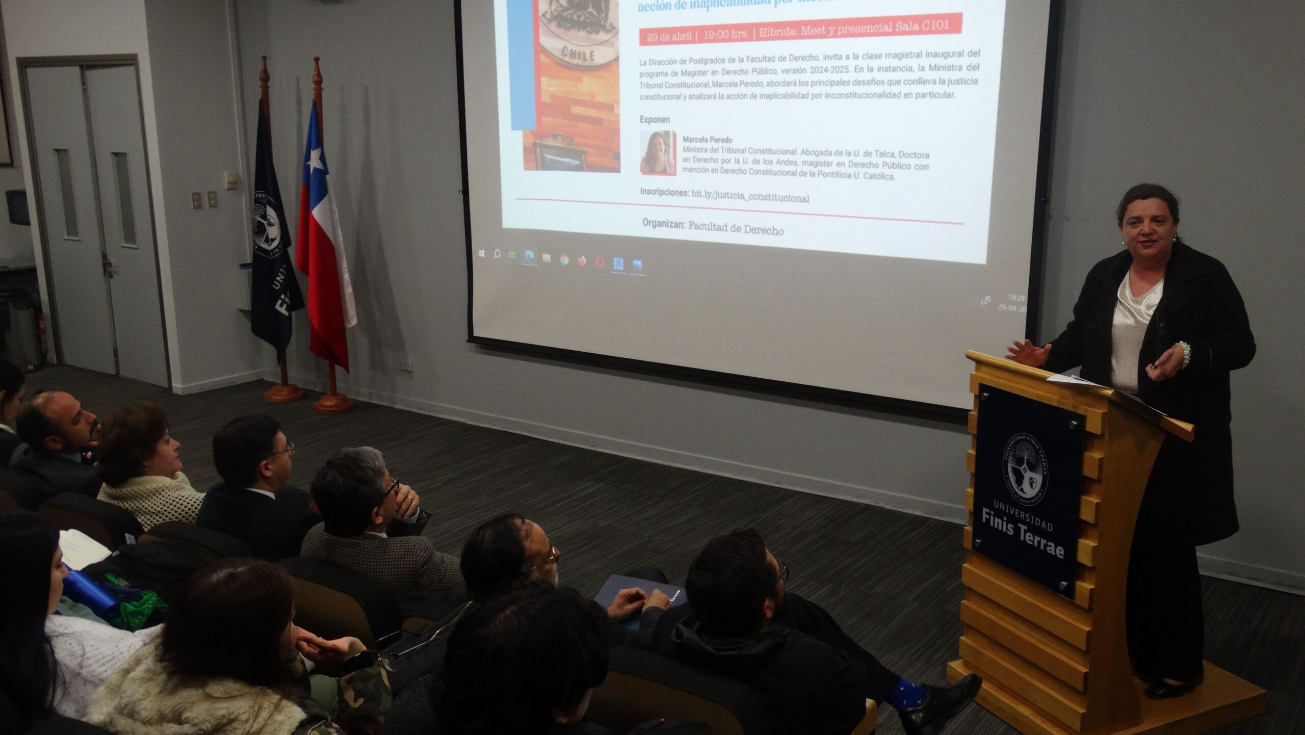 Con la presencia del decano de la Facultad de Derecho de la Universidad Finis Terrae, doctor Ignacio Covarrubias Cuevas; el director de la Escuela de Derecho, Marco Antonio Navarro Galaz; el director de Postgrados, doctor Alejandro Leiva López y el director académico del Magíster de Derecho Público de nuestra Facultad, Enrique Navarro Beltrán, se realizó la inauguración de la decimoquinta versión de dicho programa de magíster con la charla “Desafíos de la justicia constitucional: acción de inaplicabilidad por inconstitucionalidad”, a cargo de la ministra del Tribunal Constitucional y académica de la Pontificia Universidad Católica de Chile, doctora Marcela Peredo Rojas.
