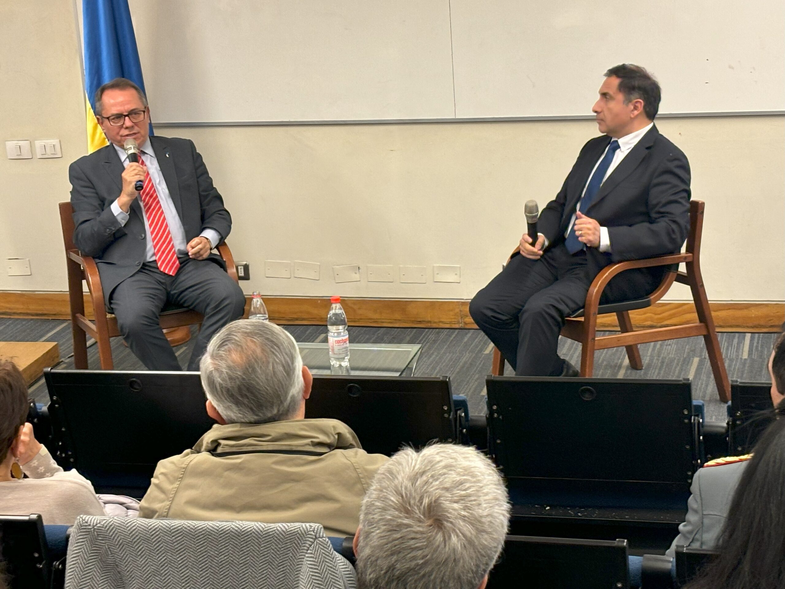 Tras la charla, el embajador y el director del Observatorio de Asuntos Internacionales, Alberto Rojas, conversaron sobre algunos aspectos de la actual guerra, como la negativa de China de asistir a esta cumbre que se desarrollará en Suiza. Posteriormente, hubo preguntas de los asistentes.
