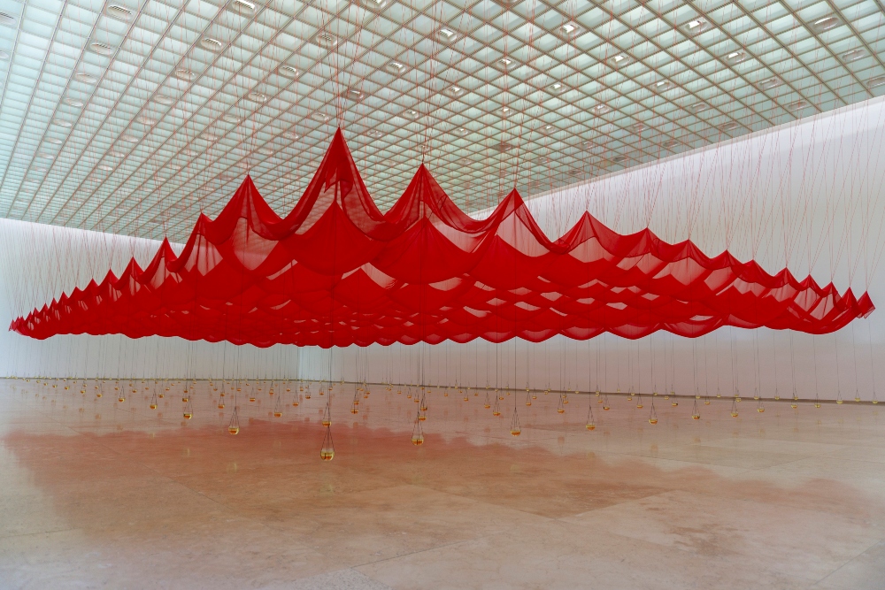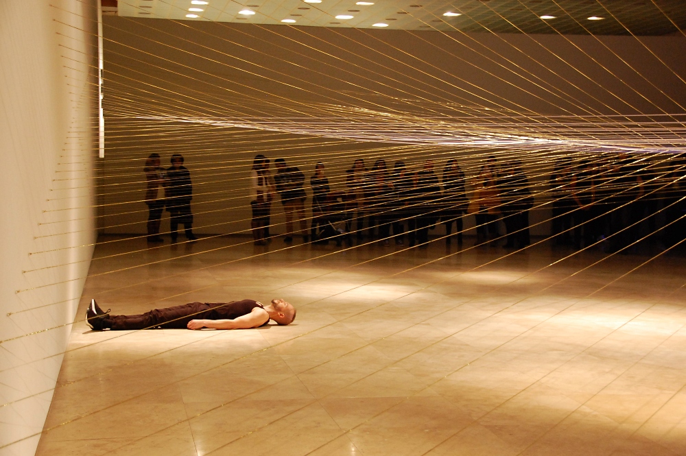 Una de las reflexiones que compartió Mahaluf sobre su proceso de creación artística fue: “No estamos solos en este mundo, por ello el espacio que nos rodea es social y colectivo. La cuestión de la relación entre mi cuerpo y los demás, parte de la posibilidad de comprender que la espacialidad entre los cuerpos, es el vacío revelador a asumir desde otra dimensión, que nos constituye como sociedad. Quería manifestar esta relación a través del cordón elástico.”