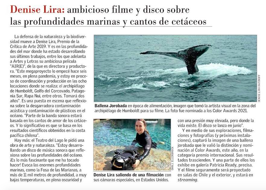 Denise es directora y productora de la película en desarrollo “AIR(E)”, una puesta en escena que reflexiona sobre la desgarradora contaminación acústica y contaminación de plásticos en el océano.