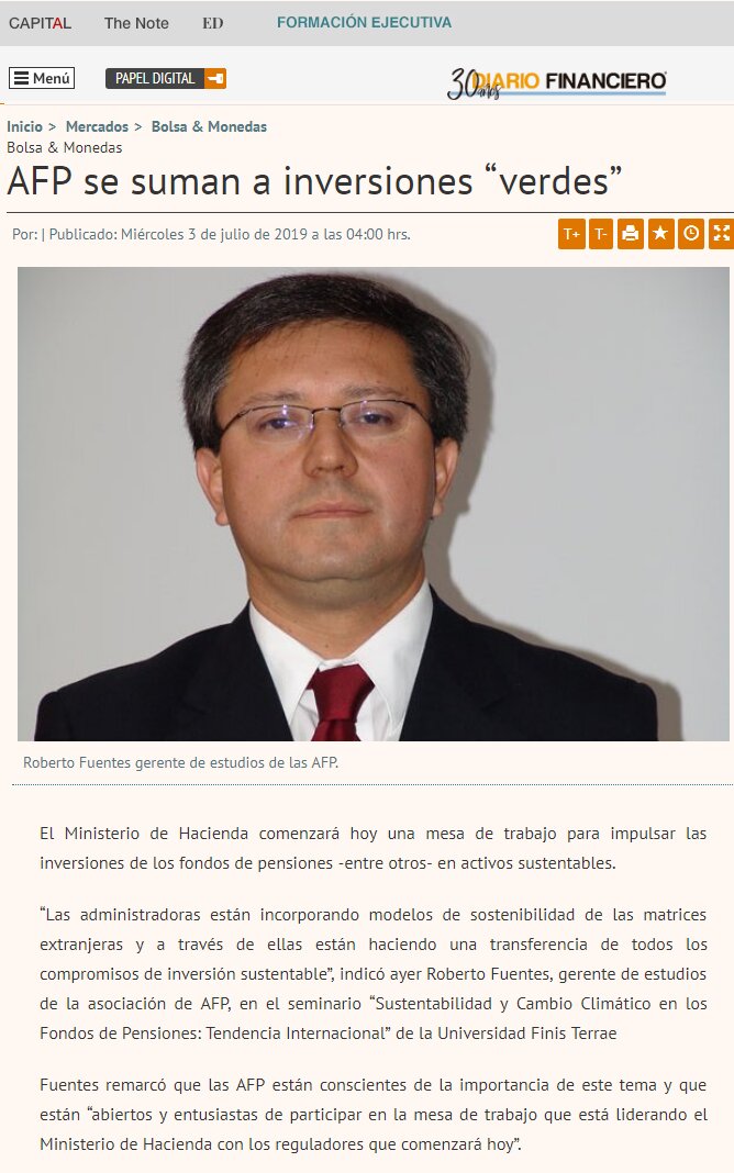 La sección Bolsa & Monedas del Diario Financiero destacó el seminario realizado el martes 02 de junio entre la Universidad Finis Terrae y la iniciativa financiera de ONU Ambiente UNEP FI. En este contexto, Roberto Fuentes, gerente de estudios de la Asociación de AFP, dijo que hoy el Ministerio de Hacienda comenzará una mesa de trabajo para impulsar las inversiones de los fondos de pensiones –entre otros- en activos sustentables, según publicó el medio.