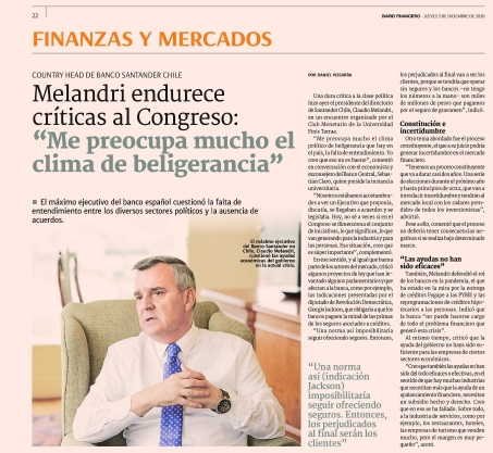 En Diario Financiero se destacó la participación de Claudio Melandri, presidente del Banco Santander de Chile, en el último encuentro del 2020 del Club Monetario de la Universidad Finis Terrae.
