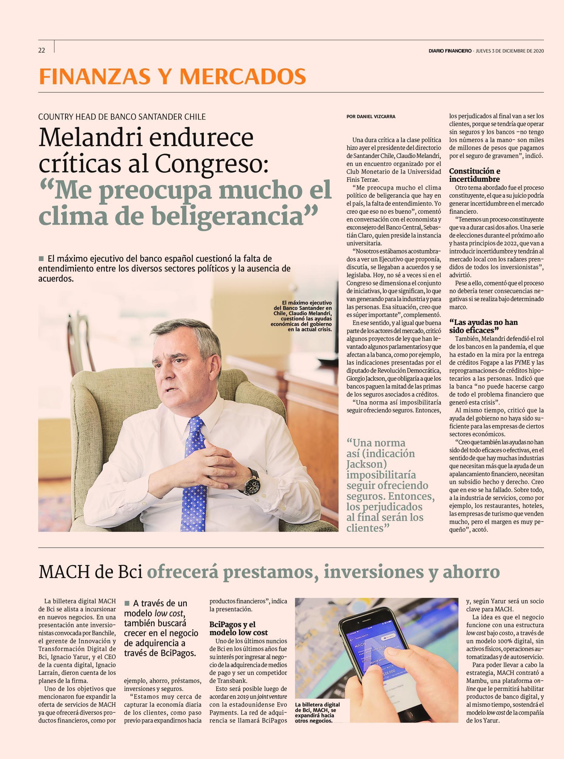 En Diario Financiero se destacó la participación de Claudio Melandri, presidente del Banco Santander de Chile, en el último encuentro del 2020 del Club Monetario de la Universidad Finis Terrae.
