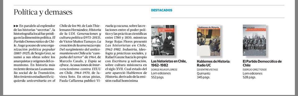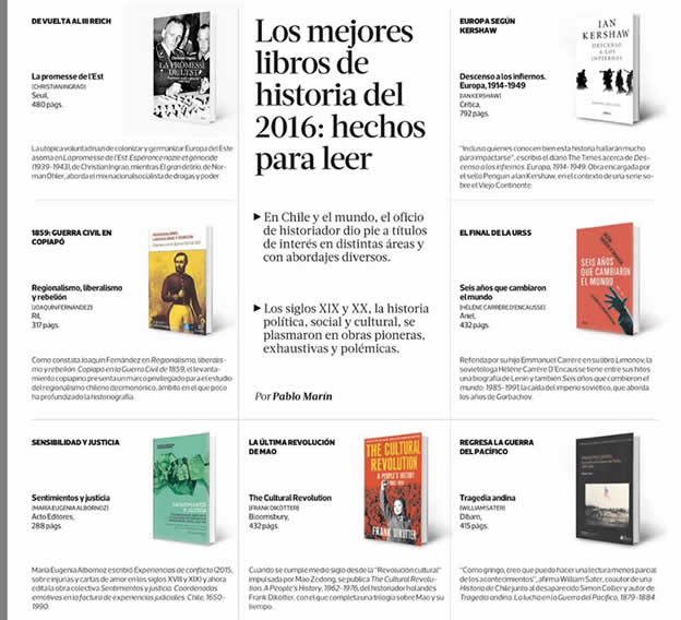 Siete fueron los ejemplares del área de historia seleccionados por el Diario La Tercera como los mejores para leer en el 2016. Tres de ellos son obras realizadas por docentes de la Escuela de Historia de la Universidad Finis Terrae.