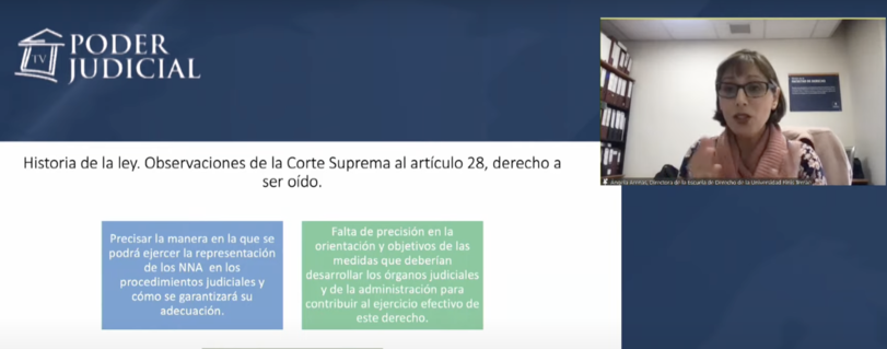 Finalmente, en su exposición la directora de la Escuela de Derecho de la U. Finis Terrae, Ángela Arenas Massa, analizó las observaciones realizadas por la Corte Suprema a la Ley 21.430 sobre garantías y protección integral sobre los derechos de la niñez y la adolescencia durante su tramitación, advirtiendo que dado que el artículo 50 de ese texto legal consagra “el derecho a una representación judicial letrada, especializada y autónoma” y que además “garantiza una provisión progresiva de su oferta por parte del Estado”, ello puede generar el problema de que “no se cuente con profesionales suficientes al momento de la entrada en vigencia de la ley”.