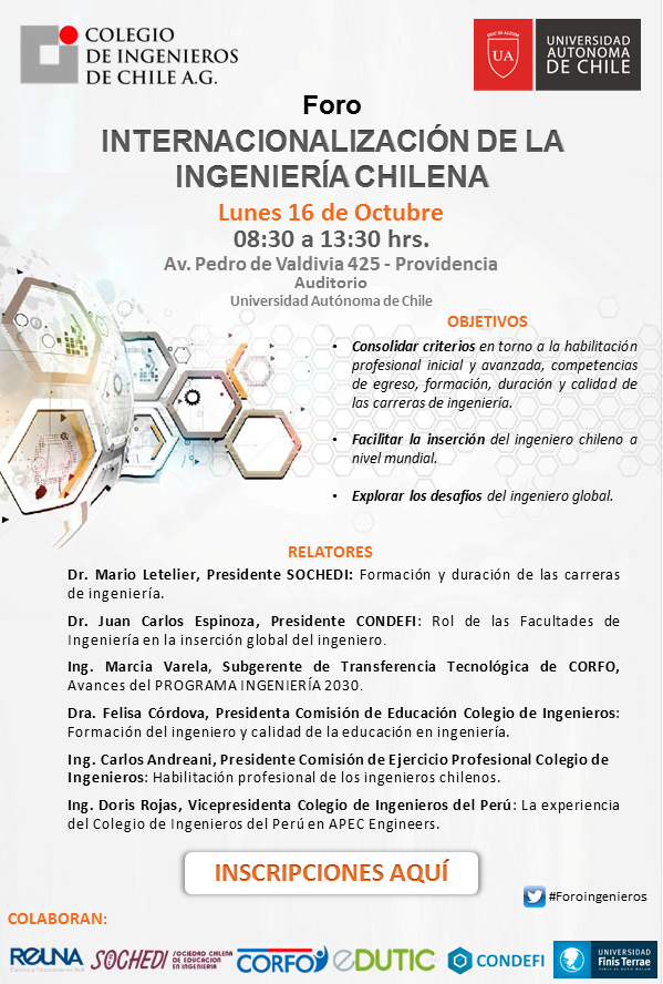 se llevará a cabo el lunes 16 de octubre en el auditórium de la Universidad Autónoma y contará con la presentación de 6 ponencias temáticas expuestas por destacados ingenieros representantes de instituciones como el Colegio de Ingenieros de Chile, Colegio de Ingenieros de Perú, SOCHEDI, CONDEFI y CORFO, quienes analizarán la situación de formación, habilitación e internalización de la ingeniería chilena y donde la U. Finis Terrae estará representada por la Directora de la Escuela de Ingeniería, Dra./Ingeniera Civil Electricista y presidenta de la Comisión de Educación del Colegio de Ingenieros de Chile, Felisa Córdova, quien participará como panelista expositora en la temática “Formación del Ingeniero y Calidad de la Educación en Ingeniería”.