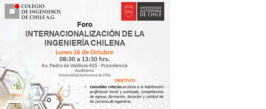 El foro organizado por la Comisión de Educación y Comisión de Ejercicio Profesional del Colegio de Ingenieros de Chile, tiene por objetivo consolidar criterios en torno a la Habilitación Profesional del Ingeniero Nacional, explorar los desafíos del ingeniero global y facilitar la inserción del Ingeniero Chileno a nivel Internacional.