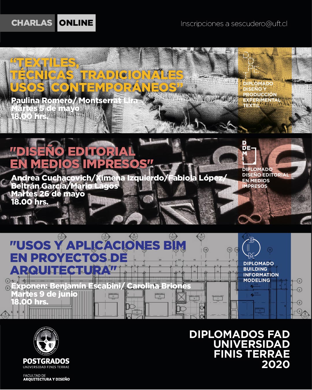 El martes 26 de Mayo estará a cargo del equipo docente del diplomado Diseño Editorial en Medios Impresos: Andrea Cuchacovich, Ximena Izquierdo, Fabiola López, Beltrán García y Mario Lagos, quienes expondrán acerca de las temáticas y alcances del programa.