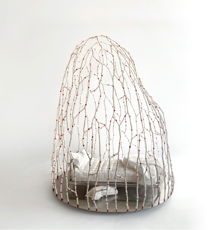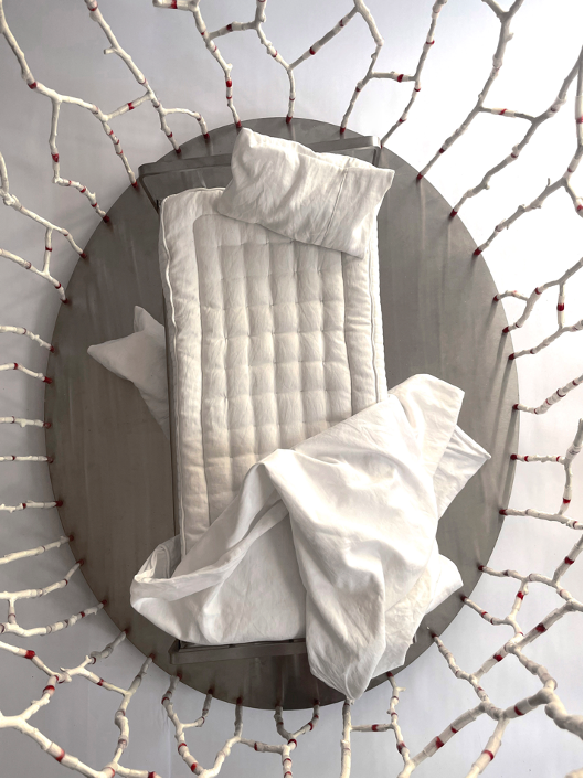 Con esta propuesta artística, Andrea Silva explora las contradicciones de los objetos y espacios cotidianos, utilizando la cama como elemento central de la obra. “La cama puede ser vista tanto como nuestro lugar íntimo y de descanso, pero también como un lugar de encierro y pesadillas”, explica la artista, quien contó con la colaboración del Taller Cerámicas Grof para el desarrollo de la obra.