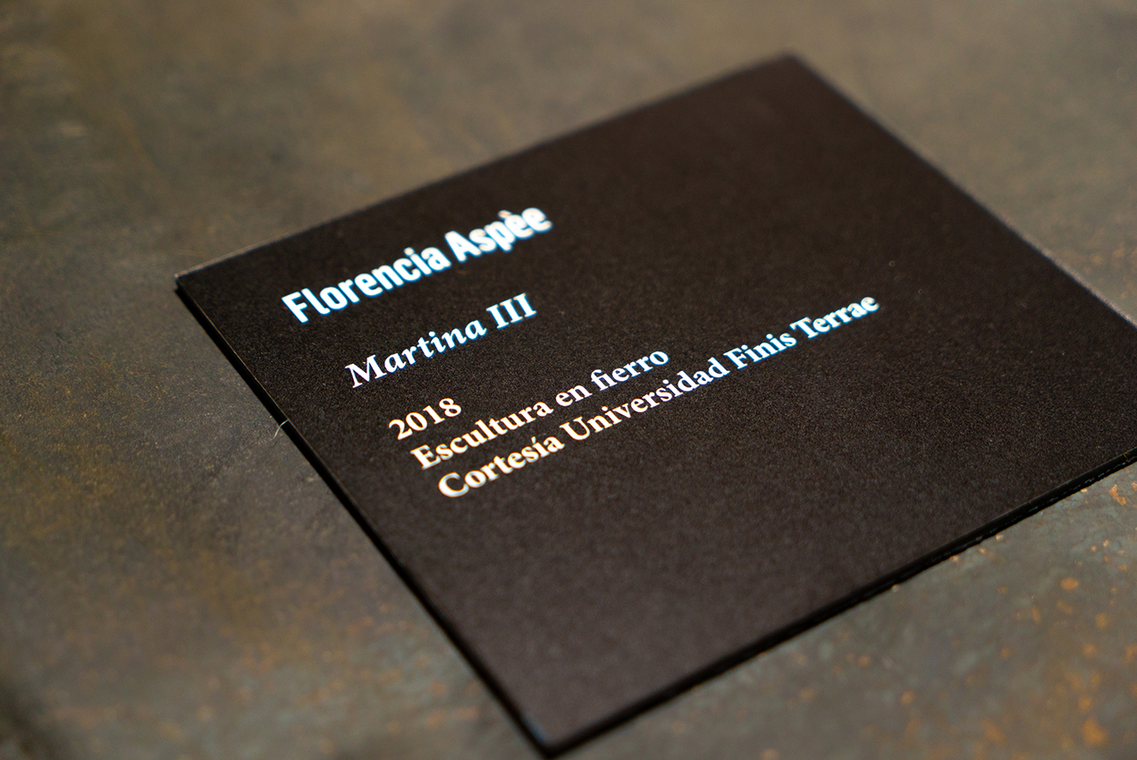 Egresada de la carrera de Artes Visuales y alumna del magíster en Investigación y Creación Fotográfica de la U. Finis Terrae, Florencia Aspee es una artista especializada en la escultura. A través de una narrativa visual, la escultora da vida a “Martina”, cetáceos que narran la historia de una ballenera que va rodeando las costas patagonas. A través de la técnica del trabajo con fierro, Florencia presenta estas colas de ballenas que hablan “un poco de esta imagen industrial avasalladora, en los mares, que son las balleneras”.