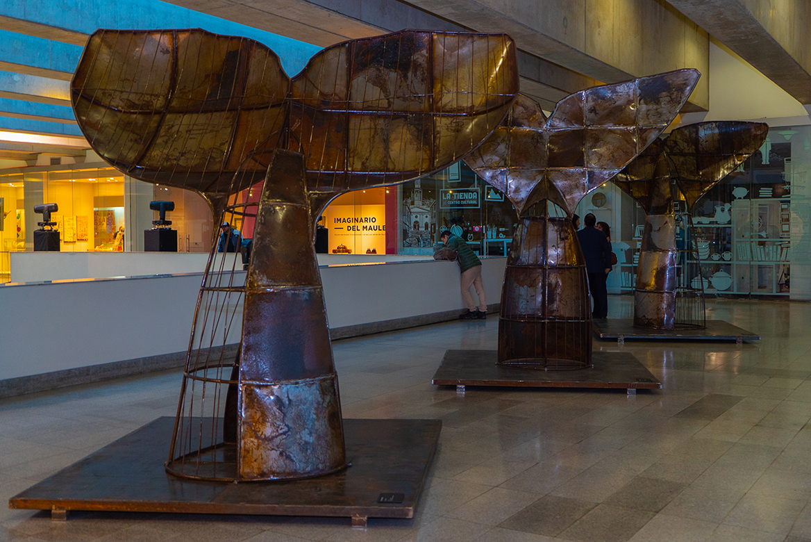 Una cola de ballena de más de tres metros de altura es una de las primeras esculturas que impacta al ingresar al Centro Cultural La Moneda. La pieza de metal corresponde a un conjunto de esculturas llamado “Martina”, creaciones en fierro realizadas por la artista visual Florencia Aspee, egresada de Artes Visuales de la U. Finis Terrae, y que son parte de la exposición colectiva “Ballenas: voces del mar”.