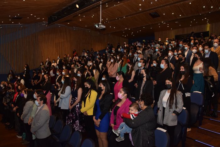 Además, en su discurso destacaron que con la pandemia por COVID-19 comenzó para ellos “una nueva forma de vivir la universidad” y terminaron invitando a que sus compañeros se pusieran “de pie y puedan mirarse mutuamente, apreciando los logros que alcanzaron, junto con esa mascarilla que representa la incomodidad de nuestros tiempos, junto a ser un emblema que representa las adversidades que superaron”, pidiendo “un gran aplauso para ustedes mismos y para nuestras familias, por acompañarnos en cada uno de los peldaños que fuimos superando y a nuestros profesores, por ser capaces de seguir dando clases de calidad en un mundo totalmente transformado”, generando un emocionante momento.