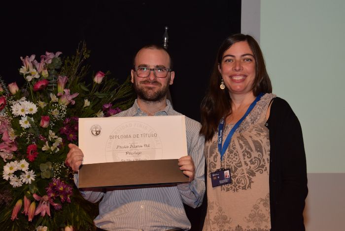 Danitza Garay y Carlos Ortega representaron a su promoción dando un conmovedor discurso, donde recordaron hitos significativos de su paso por la Escuela, como “las clases excepcionales que dio Klaus Droste en Historia de la Psicología; los relatos apasionados y profundos de Catalina Cubillos respecto a las raíces filosóficas de nuestra disciplina; la experiencia de asistir a las clases de Pablo Verdier, donde nuestras manos no descansaban pues anotamos cada palabra y comentario que pudiese brindar el profesor; el entusiasmo y ansias de aprender de la experiencia del profesor Juan Pablo Rojas y de la dinámica entre los apetitos concupiscible e irascible; al gran profesor Iván Lailhacar, quien además de enseñarnos para qué servía la desvenlafaxina o la mirtazapina, nos acompañó en nuestro paso a ser grandes profesionales, y la profesora Verónica Correa, por todo lo que aprendíamos en sus clases y por la manera cálida y familiar en cómo nos recibía en cada una de ellas”.