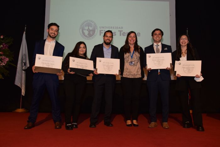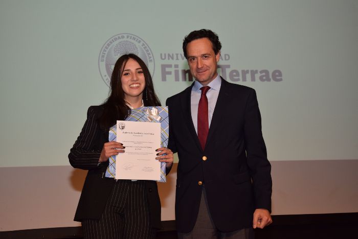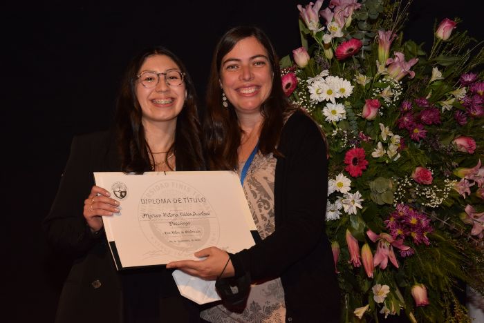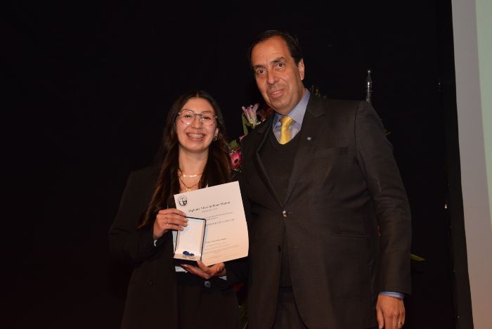 Junto a la entrega de los diplomas a todos los recientes egresados, también se destacó a Francesca Figueroa, quien obtuvo el premio a la Excelencia Académica titulada con distinción máxima y también Myriam Valdés, quien recibió el premio Vince in Bono Malum.