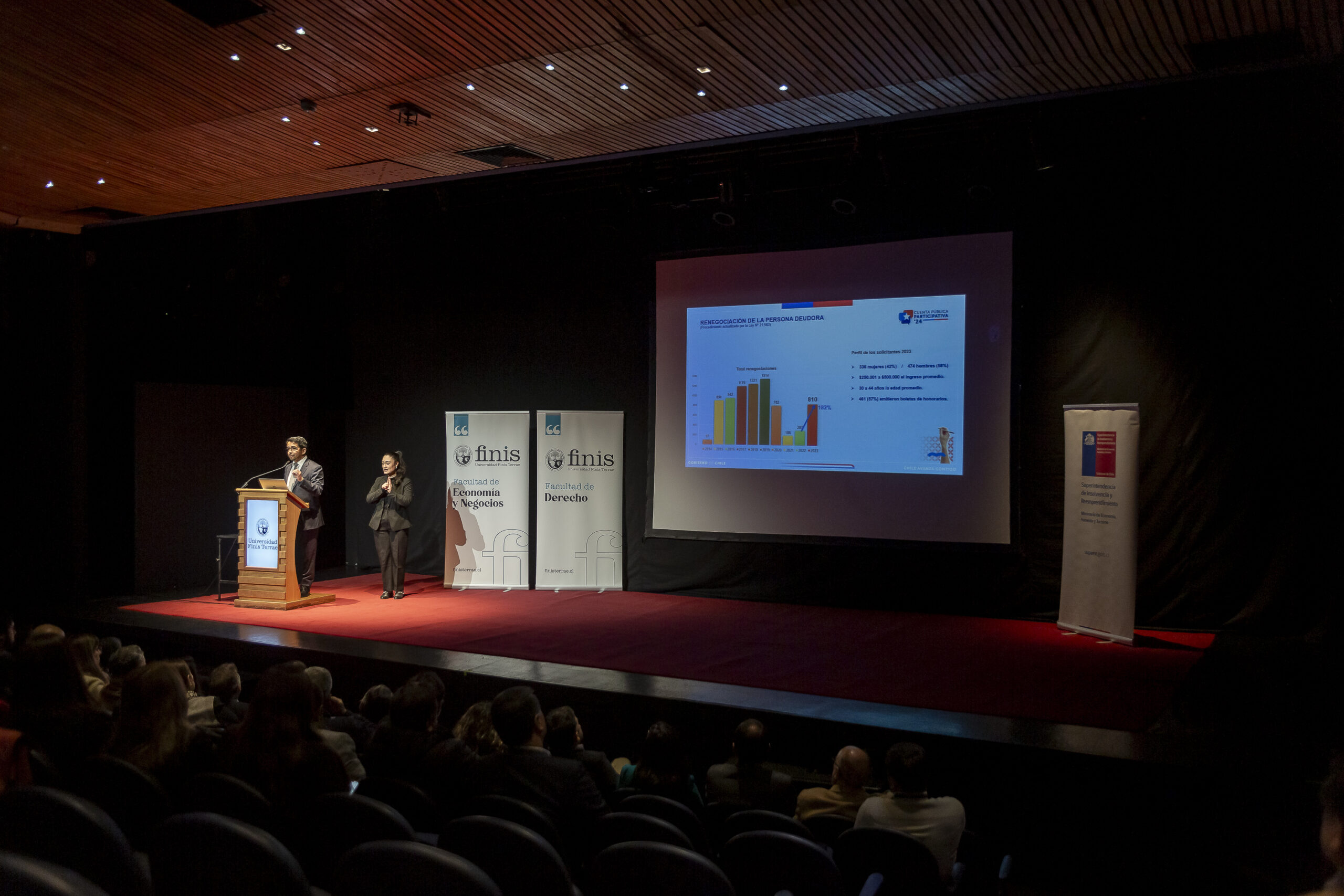 De cada 100 personas que acudieron a la Superintendencia de Insolvencia y Reemprendimiento en 2023 para renegociar sus deudas, 97 lograron un positivo acuerdo con sus acreedores, indicó el superintendente, Hugo Sánchez, durante la cuenta pública que dicho organismo llevó a cabo este martes en el teatro de la Universidad Finis Terrae, actividad organizada en conjunto por las facultades de Derecho y de Economía y Negocios de nuestra Universidad.