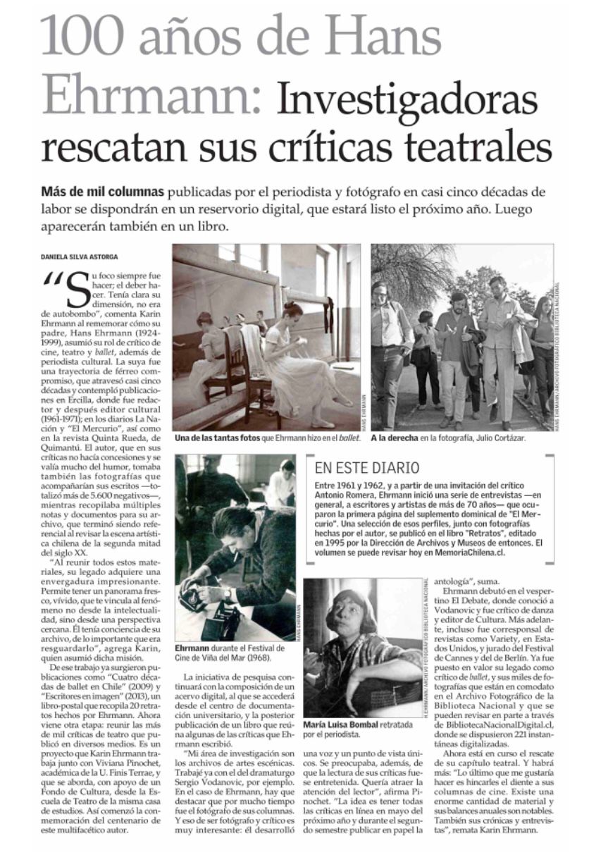 Este año se cumplen 100 años desde el nacimiento de Hans Ehrmann, periodista, fotógrafo y crítico de cine, teatro y ballet, que en su destacada trayectoria de casi cinco décadas ligado a temas culturales realizó publicaciones en la revista Ercilla y los diarios La Nación y El Mercurio, así como también en la revista Quinta Rueda de Quimantú.