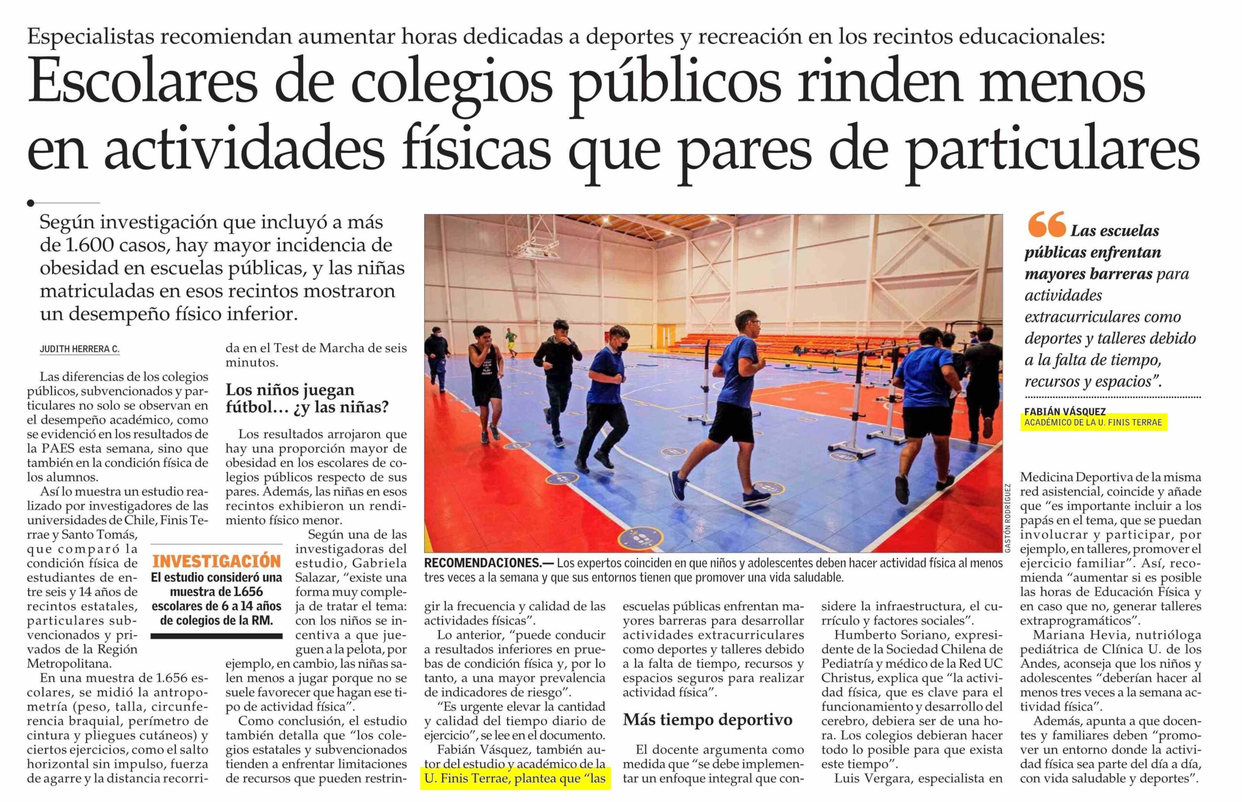 Estos resultados se publicaron en una nota del Diario El Mercurio, donde el académico de la Escuela de Nutrición y Dietética y además coinvestigador del estudio, analizó los alcances que esto trae. “Es urgente elevar la cantidad y calidad del tiempo diario de ejercicio” expresó el académico, quien añadió que “las escuelas públicas enfrentan mayores barreras para desarrollar actividades extracurriculares como deportes y talleres debido a la falta de tiempo, recursos y espacios seguros para realizar actividad física”.