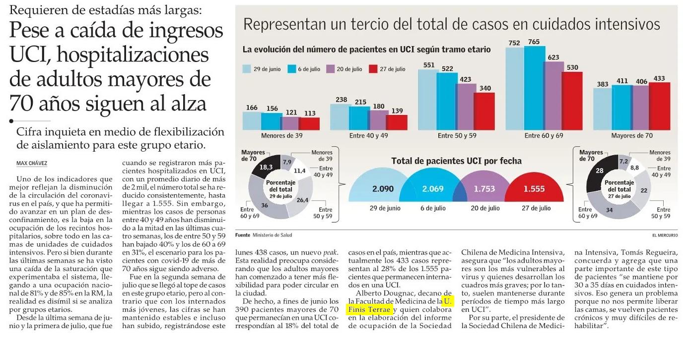 En Diario El Mercurio, elDr. Alberto Dougnac, decano de la Facultad de Medicina de la Universidad Finis Terrae, explicó que pese a la caída de ingresos UCI, hospitalizaciones de adultos mayores de 70 años sigue en alza por COVID- 19.