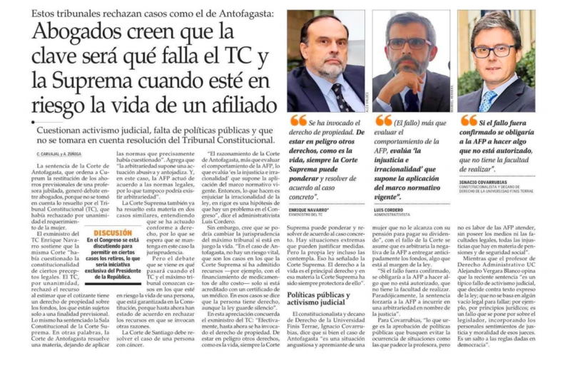 En crónica publicada en El Mercurio, el Decano de la Facultad de Derecho de la U. Finis Terrae, Ignacio Covarrubias, junto al académico de la misma facultad, profesor Enrique Navarro, abordaron la sentencia de la Corte de Antofagasta que ordenó a una AFP la restitución de los ahorros previsionales de una profesora jubilada, quien demandó dichos fondos para poder pagar los dividendos de su casa. Un fallo que desconoció lo resuelto anteriormente por el Tribunal Constitucional en materias similares.
