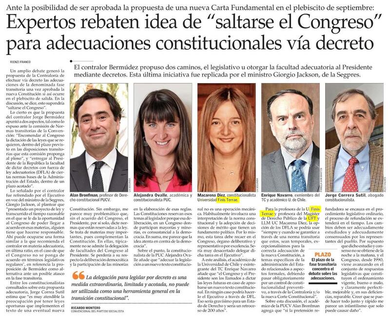 Consultada junto a otros destacados académicos constitucionalistas sobre esta polémica propuesta, la profesora de la Facultad de Derecho de la Universidad Finis Terrae, Macarena Diez Pallamar, señaló que a su juicio la opción de los “decretos con fuerza de ley adecuatorios” (DFLA) se podrían usar “siempre y cuando se garantice a través de una norma transitoria que estos sean temporales, excepcionalísimos para la correcta adecuación de la nueva Constitución, a temas específicos de la administración del Estado relacionados a aspectos formales, debiendo pasar obligatoriamente por un control de constitucionalidad preventivo, a través de la Contraloría y/o la nueva Corte Constitucional”.