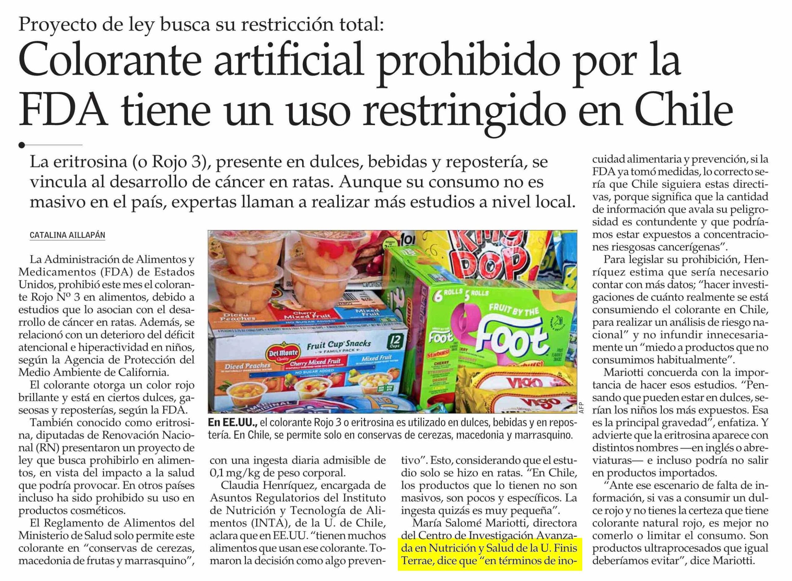 El Mercurio | Dra. María Salomé Mariotti habló sobre colorante artificial prohibido por la FDA que tiene uso restringido en Chile