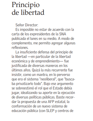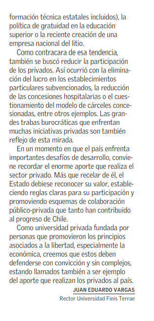 En una carta publicada en El Mercurio, el rector de la Universidad Finis Terrae, Juan Eduardo Vargas, valoró la reflexión planteada por expresidentes de la Sociedad Nacional de Agricultura (SNA) sobre la importancia de defender el principio de la libertad económica.