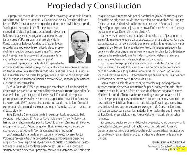 “En nuestro país, ya la Carta de 1818 garantizaba el derecho de propiedad, agregando la de 1822 que siempre el expropiado tendría derecho a ser indemnizado”, explicó el docente en su columna.