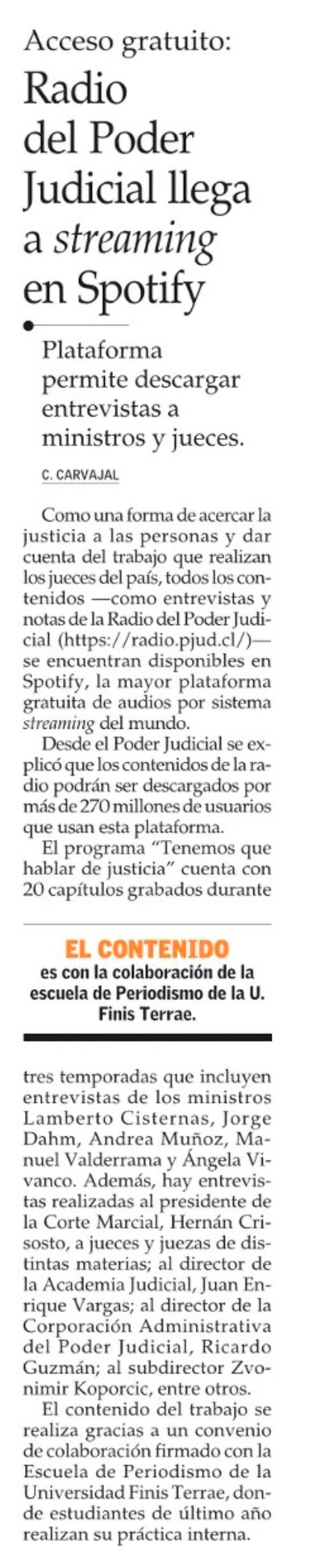 En diario El Mercurio se destacó la llegada a la plataforma Spotify del programa “Tenemos que hablar de justicia”, una iniciativa del Poder Judicial en conjunto con la Escuela de Periodismo de la U. Finis Terrae.