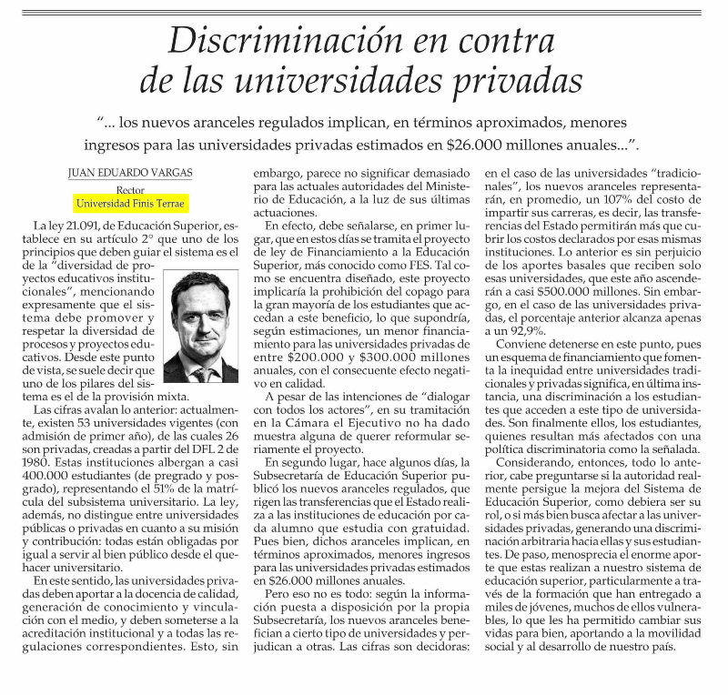 Al respecto, el rector de la Universidad Finis Terrae, Juan Eduardo Vargas, levantó las alertas en una columna para el diario El Mercurio sobre las consecuencias que tiene la concreción de estas medidas, específicamente para las universidades privadas, acusando una posible discriminación contra estas instituciones.