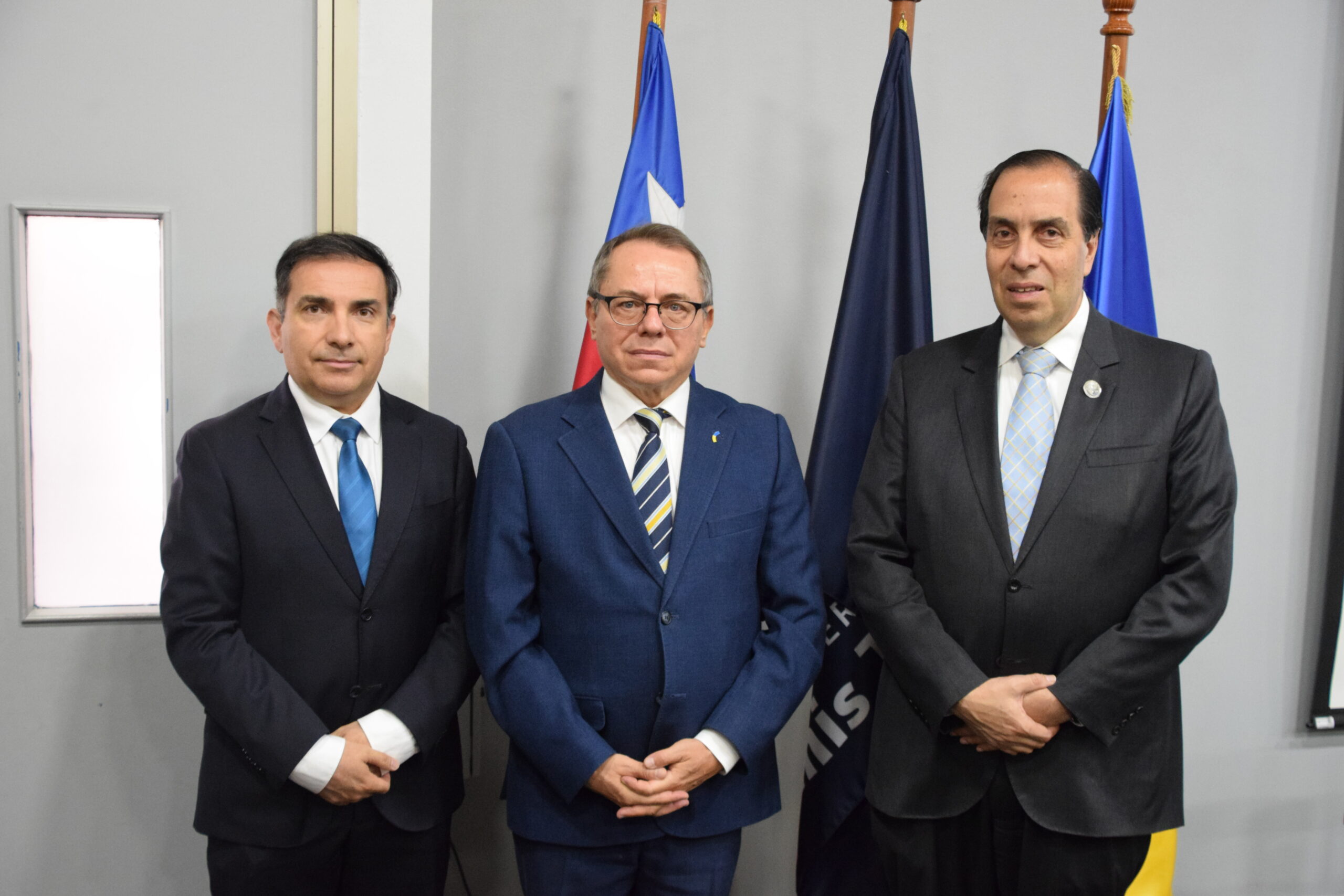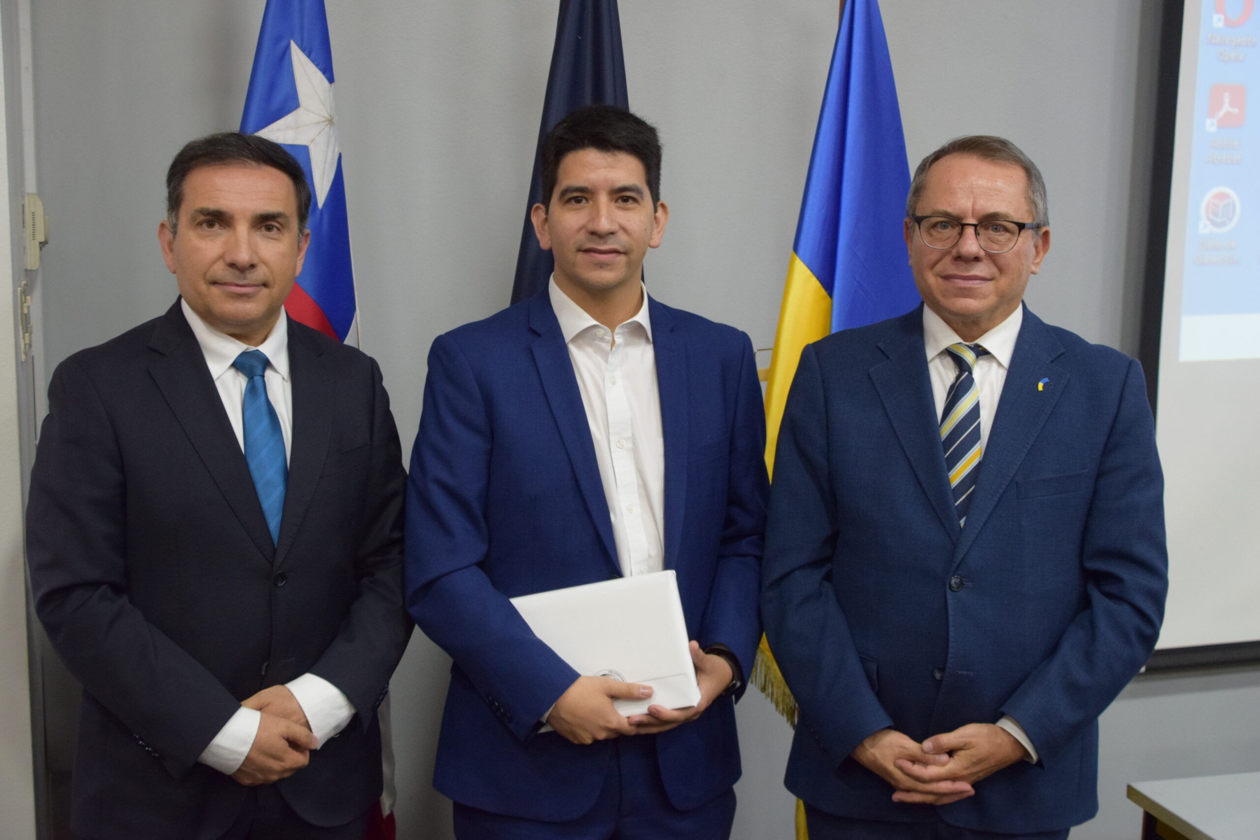 - Alberto Rojas, director del Observatorio de Asuntos Internacionales; Yuri Diudin, Embajador de Ucrania en Chile; Cristian Nazer, rector U. Finis Terrae.