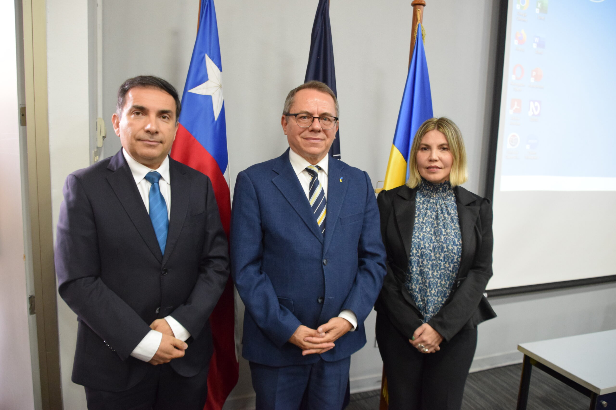 - Alberto Rojas, director del Observatorio de Asuntos Internacionales; Yuri Diudin, Embajador de Ucrania en Chile; Vanessa Cárdenas, académica Periodismo U. Finis Terrae.