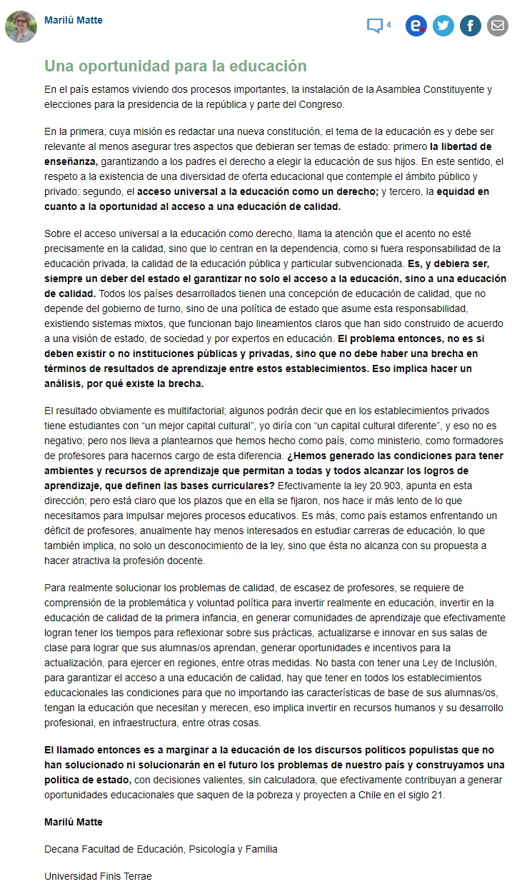 En parte de su columna la decana explica que “Para realmente solucionar los problemas de calidad, de escasez de profesores, se requiere de comprensión de la problemática y voluntad política para invertir realmente en educación, invertir en la educación de calidad de la primera infancia, en generar comunidades de aprendizaje que efectivamente logran tener los tiempos para reflexionar sobre sus prácticas, actualizarse e innovar en sus salas de clase para lograr que sus alumnas/os aprendan, generar oportunidades e incentivos para la actualización, para ejercer en regiones, entre otras medidas. No basta con tener una Ley de Inclusión, para garantizar el acceso a una educación de calidad, hay que tener en todos los establecimientos educacionales las condiciones para que no importando las características de base de sus alumnas/os, tengan la educación que necesitan y merecen, eso implica invertir en recursos humanos y su desarrollo profesional, en infraestructura, entre otras cosas”.