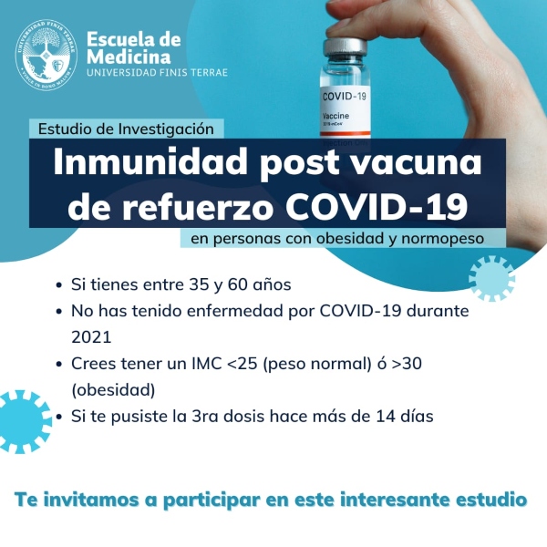 Buscando avanzar en el mejor conocimiento de la pandemia, la Dirección de Investigación de la Escuela de Medicina de la Universidad Finis Terrae está desarrollando un estudio respecto a la inmunidad generada tras la aplicación de la primera vacuna de refuerzo contra el COVID-19.