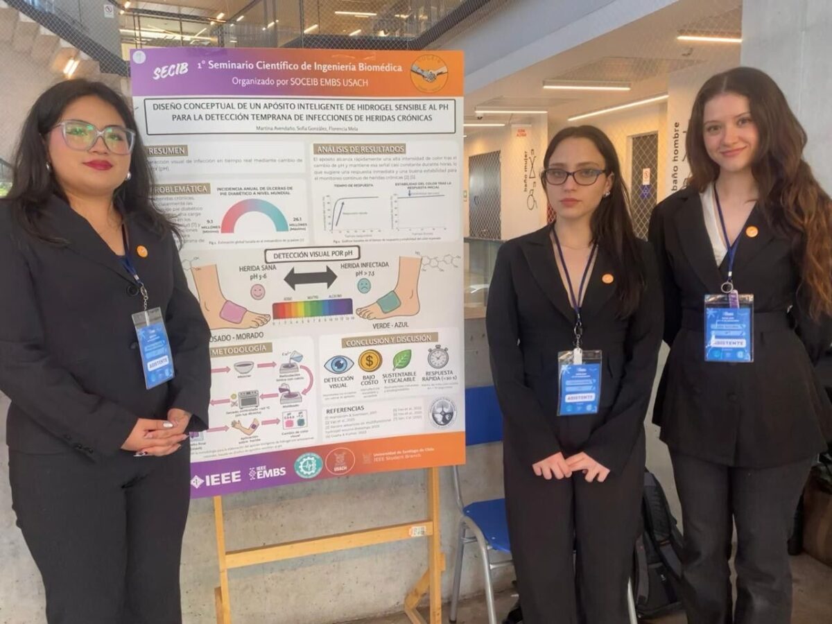 El póster representante de la U. Finis Terrae, consistió en la propuesta del desarrollo de un apósito inteligente capaz de detectar cambios en el pH de las heridas, lo que permitiría identificar de forma temprana la presencia de infecciones, especialmente en personas con diabetes.