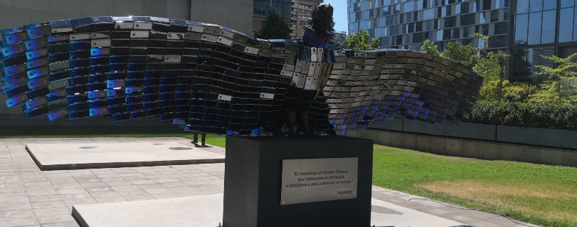 Durante tres semanas trabajaron los estudiantes y docentes del Taller de Escultura de la Escuela de Artes Visuales de la Universidad Finis Terrae para confeccionar la escultura de un cóndor chileno con 1.147 maquetas del celular Huawei Mate 20 Pro en diversos colores, que fueron unidas muy cuidadosamente a una estructura de fierro.