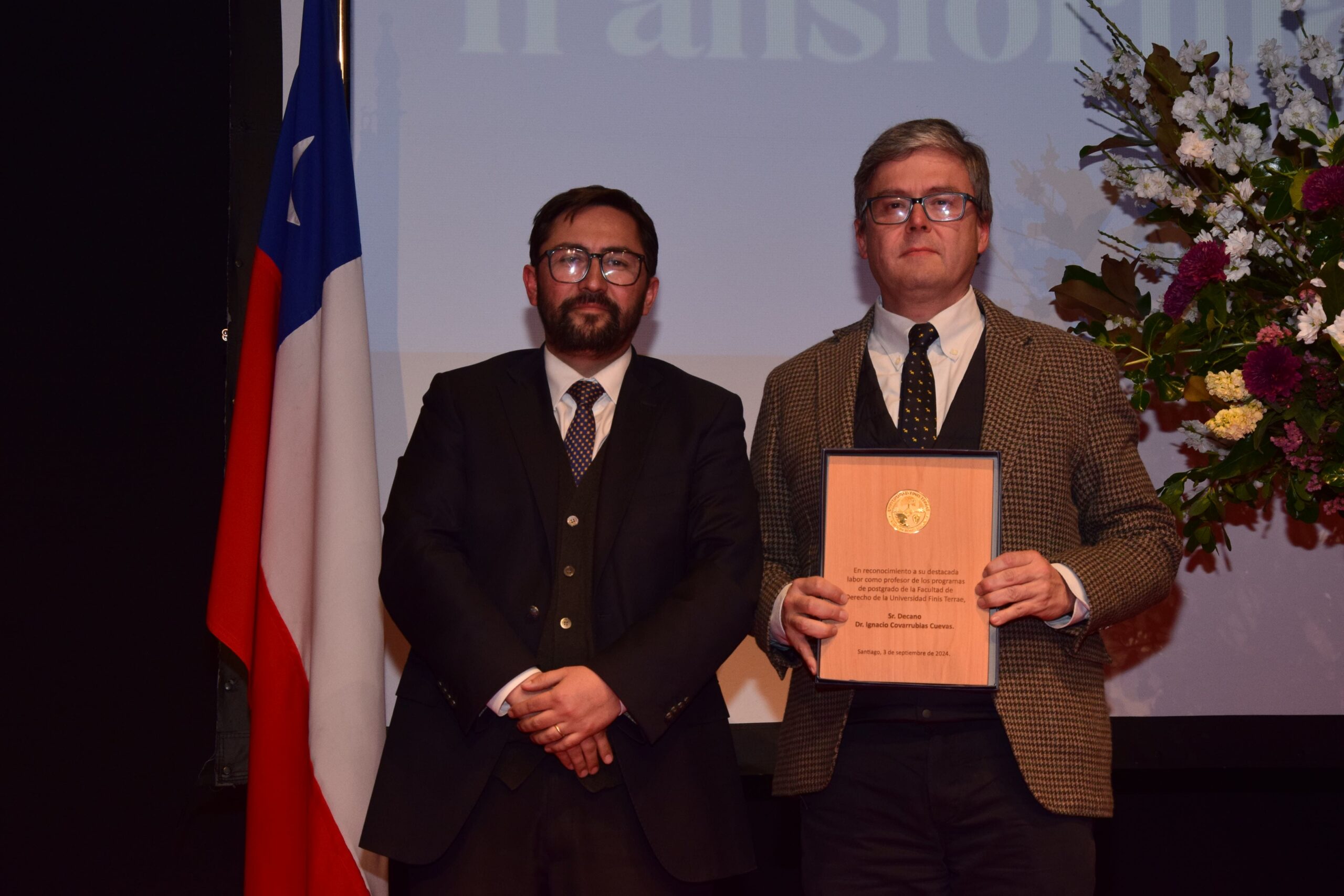 Durante la ceremonia se rindió homenaje a los docentes que cumplieron una década como profesores de los diversos programas de nuestra Facultad —Cristián Sepúlveda, David Ibaceta, Eugenio Evans, Gabriel Celis, Gerardo Ovalle, Joaquín Vicuña, José Ignacio Ovalle, Julio Pellegrini, José Ignacio Vásquez, Marta Herrera, José Ignacio Zaldívar y Sandra Ponce—, a nuestro rector Ignacio Covarrubias por “su destacada labor como profesor de los programas de postgrado”, así como al director de postgrados, Dr. Alejandro Leiva, quien deja nuestra Universidad para emprender nuevos desafíos.