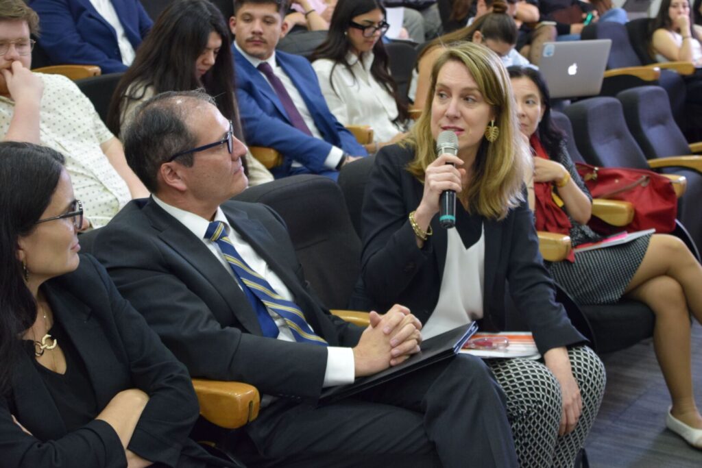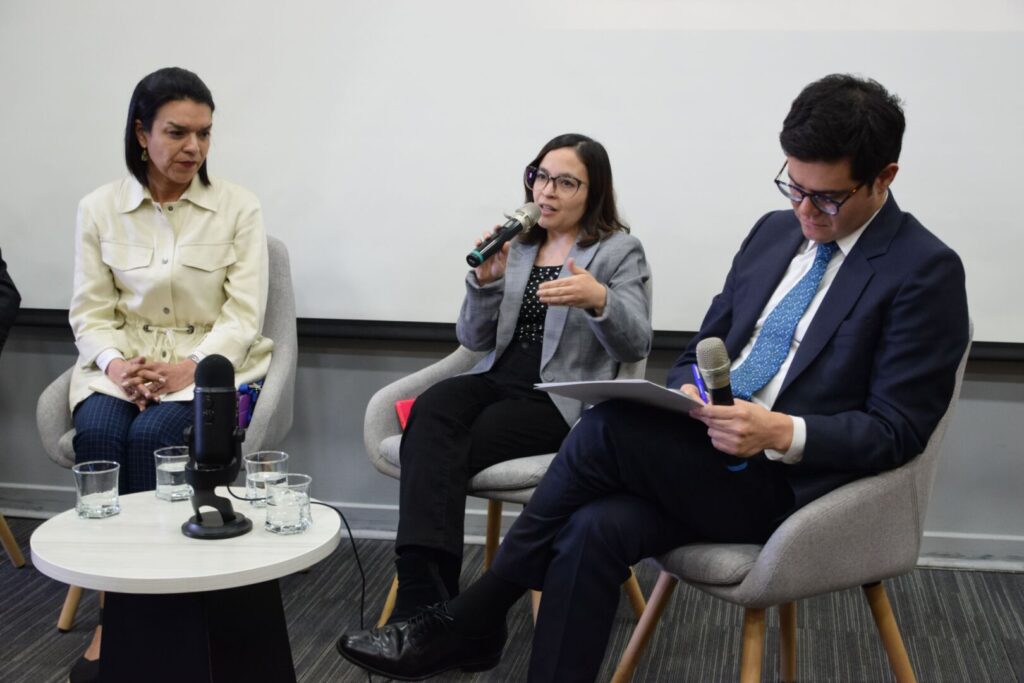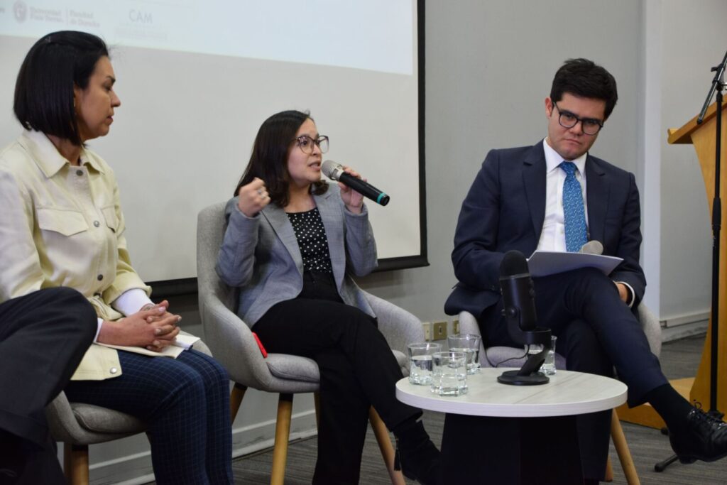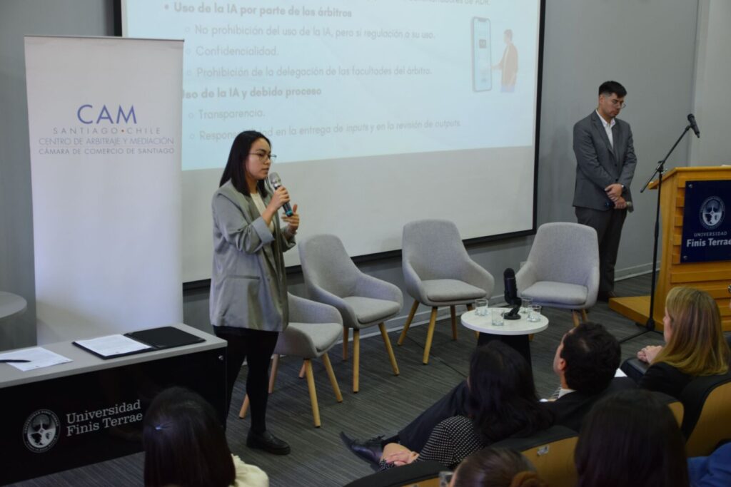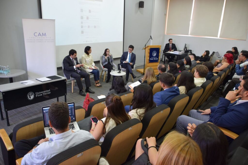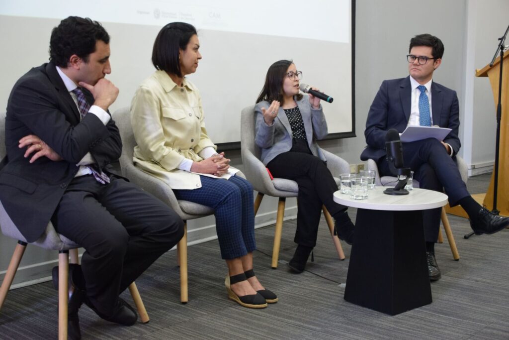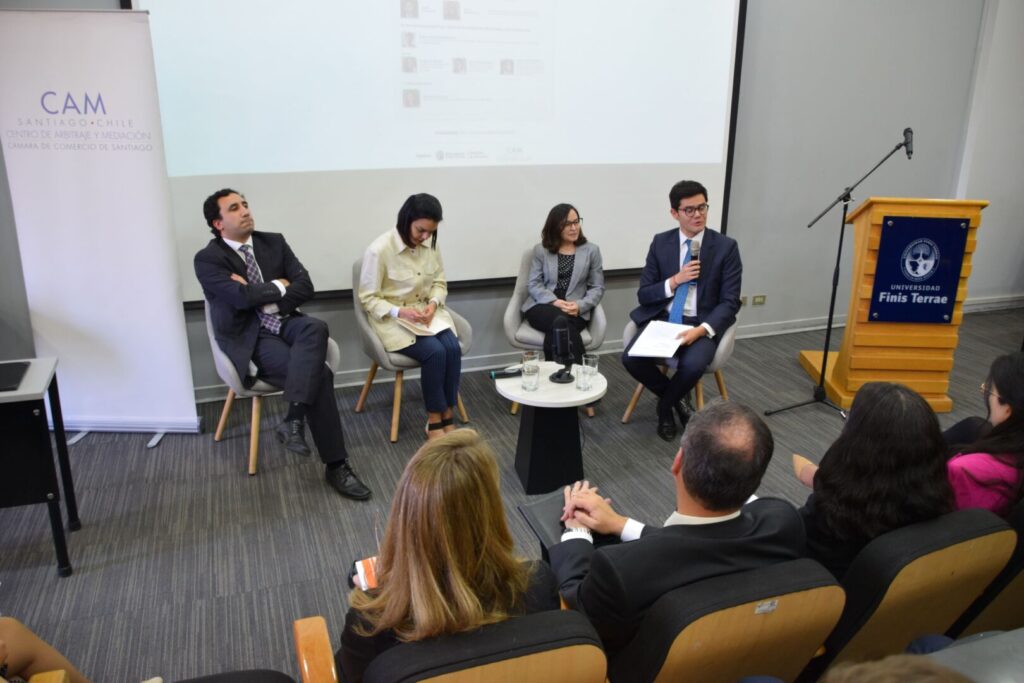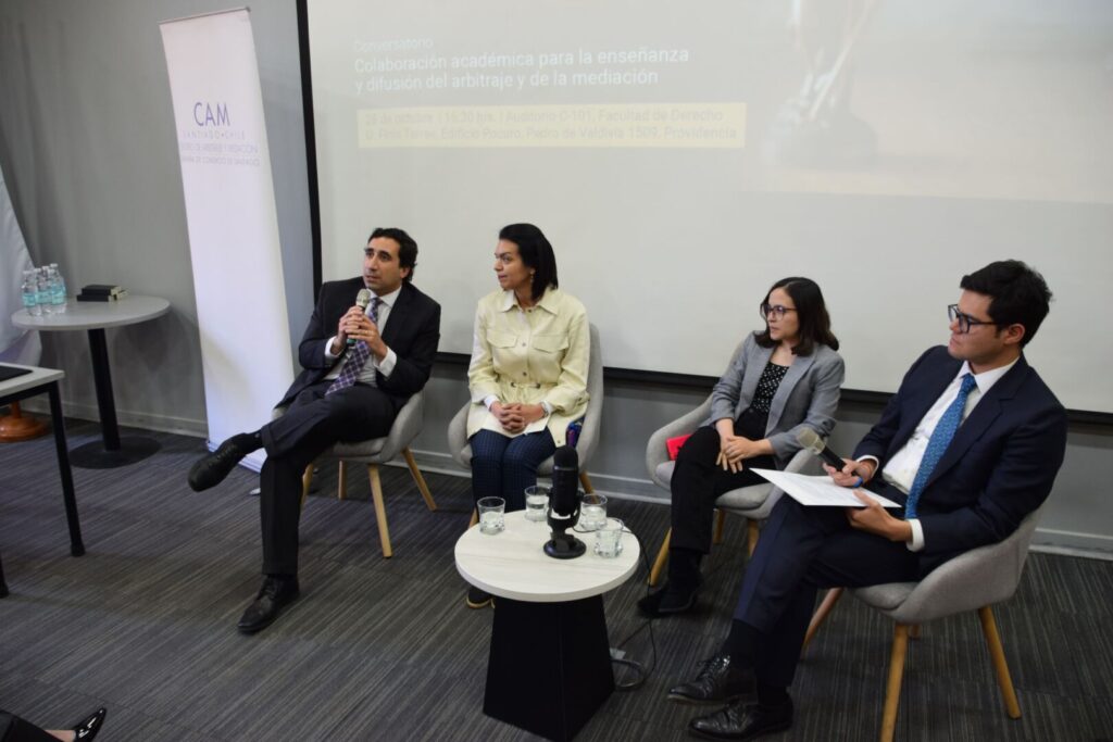 Luego de ello, se dio inicio a un conversatorio moderado por el profesor de nuestra Facultad, Ignacio Cantillana Moreira, el que contó con la participación de Paulina Pino Burgués, Case Manager de la Unidad de Mediación del CAM Santiago; la directora de Investigación de nuestra Facultad, Dra. Ivette Esis Villarroel; y nuestro director de Vinculación con el Medio y Comunicaciones y árbitro joven del CAM Santiago, Juan Luis Chomali Kattan