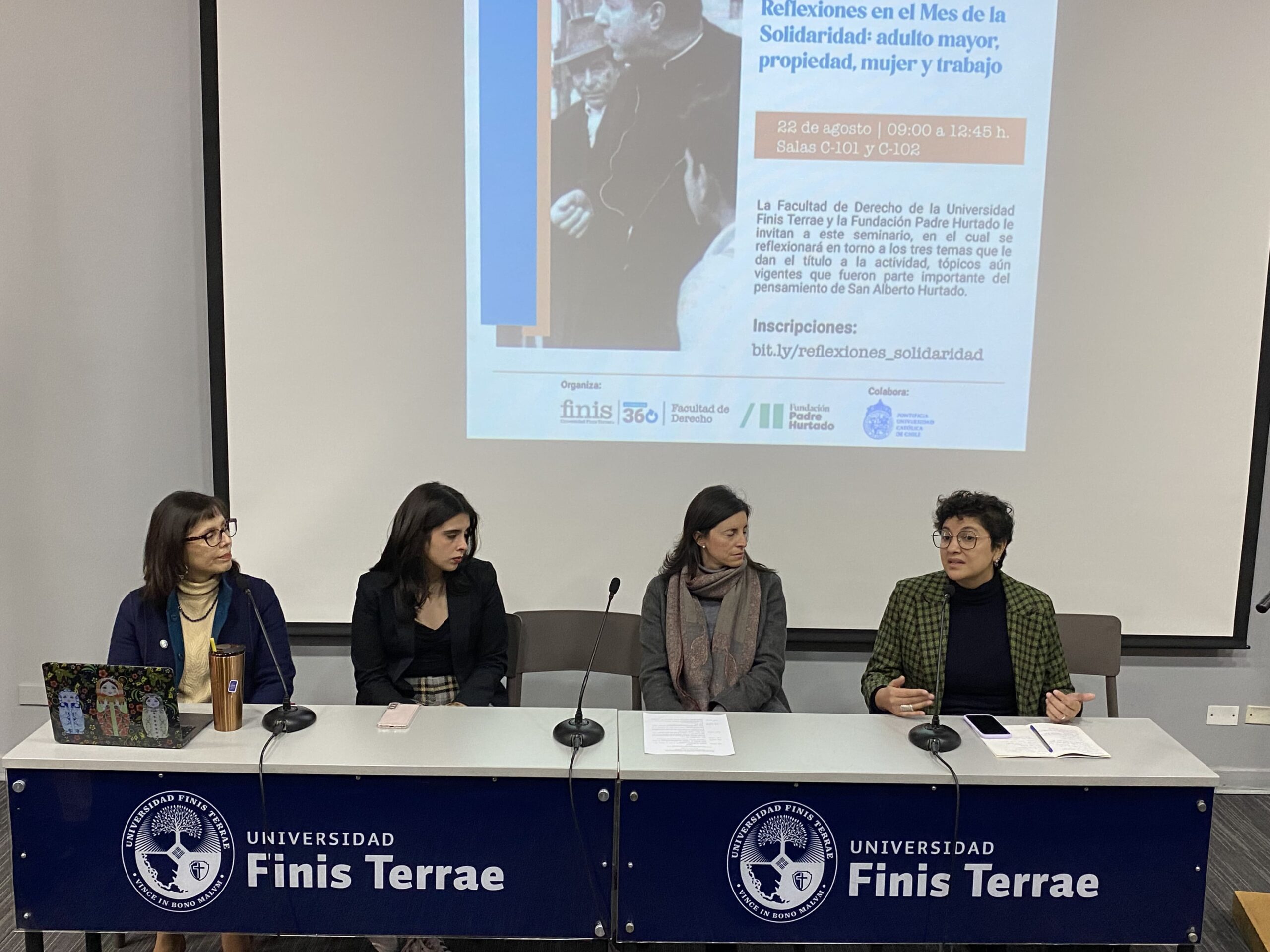En el seminario, académicos y estudiantes reflexionaron en torno a tres temas que el santo patrono de nuestra Facultad desarrolló durante sus estudios de Derecho: adulto mayor, propiedad, mujer y trabajo. Tres temáticas que tributan a “salud y bienestar”, una de las áreas prioritarias de desarrollo académico definidas por nuestra Facultad como parte de sus políticas de vinculación con el medio, la cual busca aportar desde la academia al desarrollo de las personas y su calidad de vida.