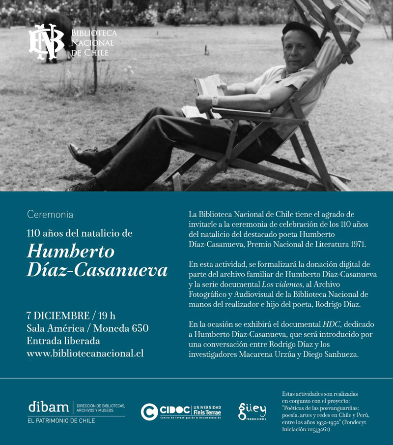A las 19:00 horas del miércoles 7 de diciembre, en la Sala América de la Biblioteca Nacional, se llevará a cabo la ceremonia de homenaje con motivo de la conmemoración de los 110 años del nacimiento de Humberto Díaz-Casanueva. En la ocasión se exhibirá el documental dedicado al mencionado escritor, de la serie Los videntes. Además, habrá de un conversatorio entre Rodrigo Díaz, realizador de la serie, Diego Sanhueza y  Macarena Urzúa, investigadora CIDOC y profesora de la Escuela de Literatura de nuestra Universidad, sobre la obra de Díaz-Casanueva, Rosamel del Valle y Ludwig Zeller.